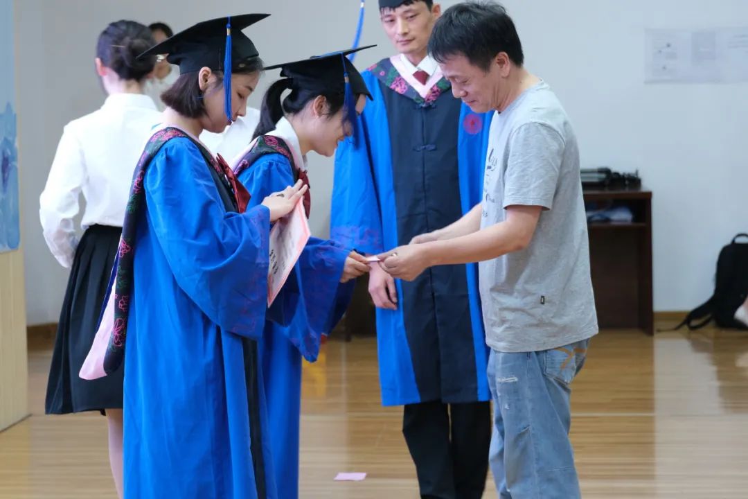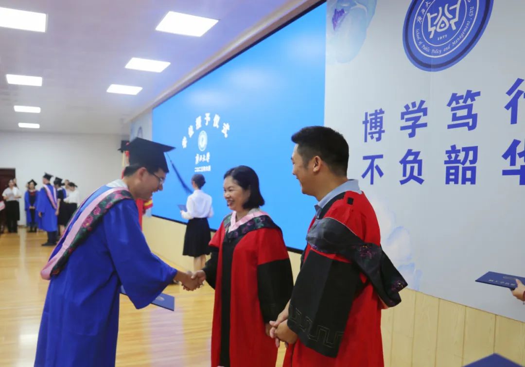 学位授予环节,周均旭宣读学位授予决定,毕业生们随着礼乐声依次上台。毕业班班主任雷文艳、钟革秋为学生整理衣冠,聂鑫为毕业生行拨穗礼,并一一合影,黎昌珍教授与魏万青教授分别和毕业生握手祝贺。最后,在全体师生的校歌大合唱中,我院公共管理专业硕士(MPA)毕业典礼暨学位授予仪式圆满落幕。