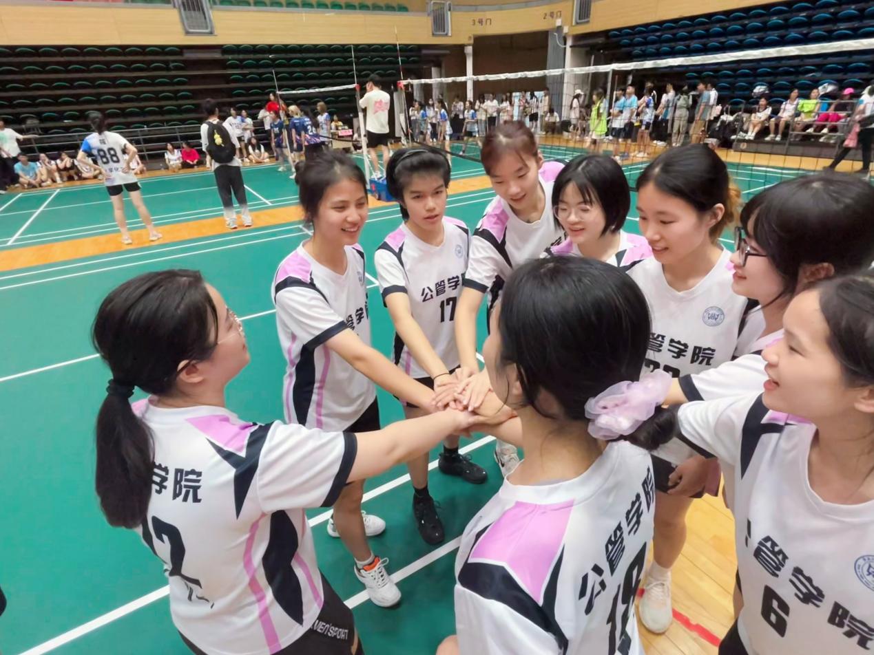 我院女队则前后对战林学院和法学院。在与传统强队林学院的角逐中,女队成员们坚持不懈,积极调整战术,虽未能进入决赛,但努力拼搏的精神值得赞叹。在与法学院三四名对决赛中,虽首局状态欠佳,未能适应对方战术而憾失一局,但队员们并未气馁,而以更加饱满的精神状态迎战,最终以2比1的比分赢得比赛,书写了学院女排的新篇章,首创女子组第三名的佳绩。我院公共管理研211班的王婷是女子队的领队,作为一名准毕业生,她表示最后一次代表公管出战,要拼尽全力,为集体荣誉而战。公共管理研221班的阮文俏是女子队的教练,她在赛场上沉着冷静,理性分析战局,与队友互相配合,保持专注,荣获最佳攻手。她表示正是队友们顽强拼搏与努力、互相鼓励与支持、彼此包容与安慰在本次运动会中取得了首次获得女子组季军佳绩。
