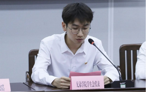 资源环境与材料学院学生会执行主席郭凯森代表兄弟学院学生会致辞。他对我院学生会工作取得成绩表示祝贺,希望两院学生会始终发扬精诚团结的合作精神,工作相互支持、共同发展,在交流中结下深厚友谊,携手共进,共建两院学生会的美好未来。