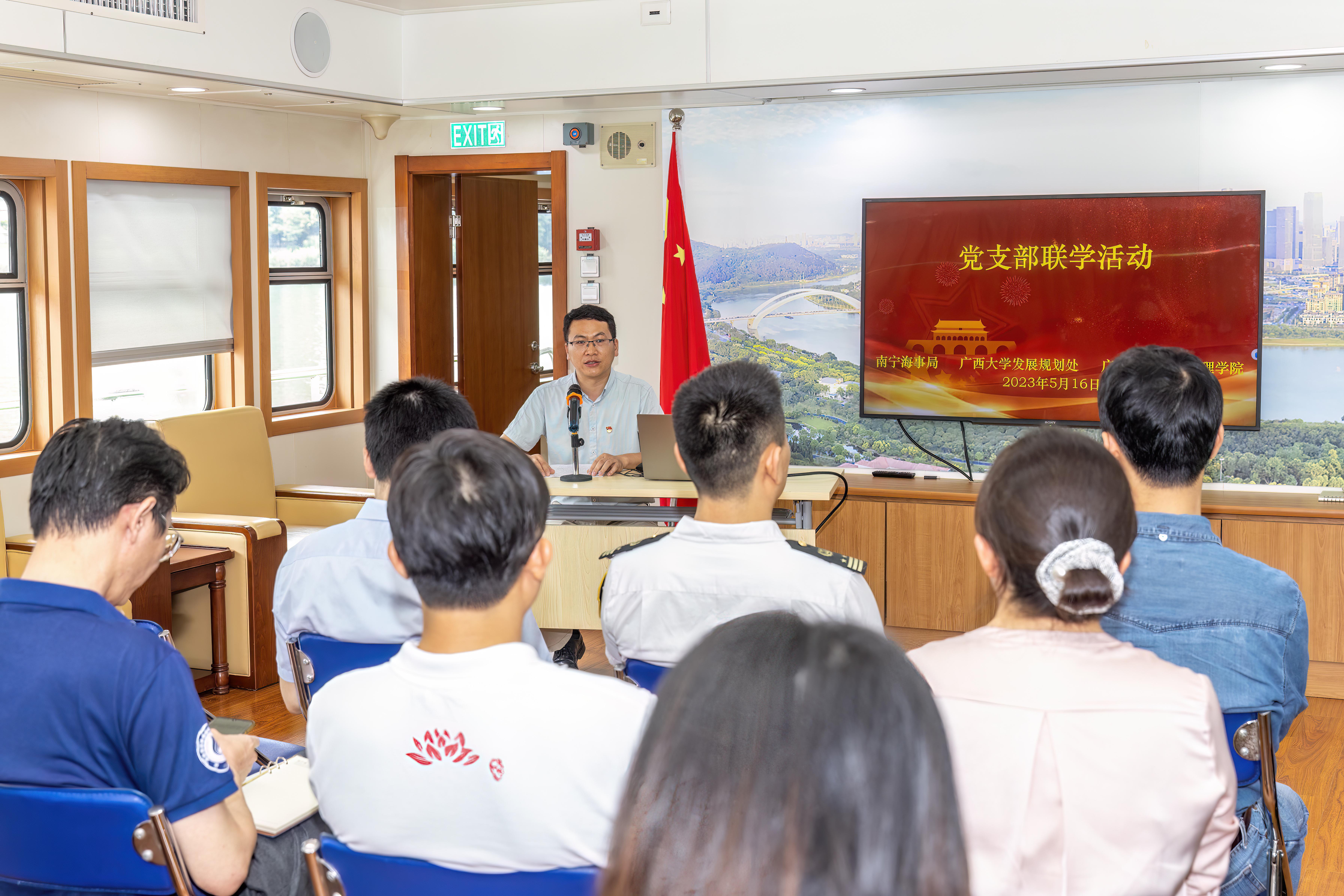在南宁海事局党委委员、副局长黄锐的带领下,太阳集团网址8722和太阳网集团tcy8722发展规划处的党员同志们首先参观了海巡1011“邕江流动党校”,详细了解南宁海事局党建工作的新思路、新理念、新方式,并学习其以“红船精神”为引领,维护南宁首府水域安全、推动平陆运河建设的党建与业务相结合的优秀经验。 随后太阳网集团tcy8722发展规划处副处长、党支部青年及统战委员马仲辉同志以“学科建设服务地方经济社会发展”为主题讲专题党课。
