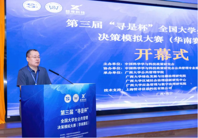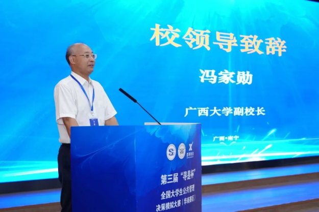 冯家勋在开幕上致辞,本次大赛是为贯彻党的二十大精神,为党育人为国育才,能够切实推进公共管理类专业实践与教学相融合,引导公共管理类专业积极开展创新人才的培养,成为公共管理学在教育教学方面的重要补充。