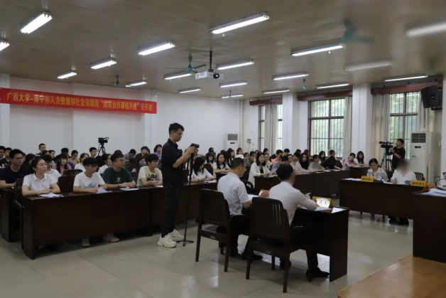 我院老师吴凡向南宁人社局等各单位表示感谢。她指出,将仲裁示范庭带进课堂,应用“政产学研”相结合的授课模式,帮助学生加深对劳动关系的理解,了解劳动仲裁的流程,普及法律知识,回应“构建和谐的劳动关系”的现实需要。