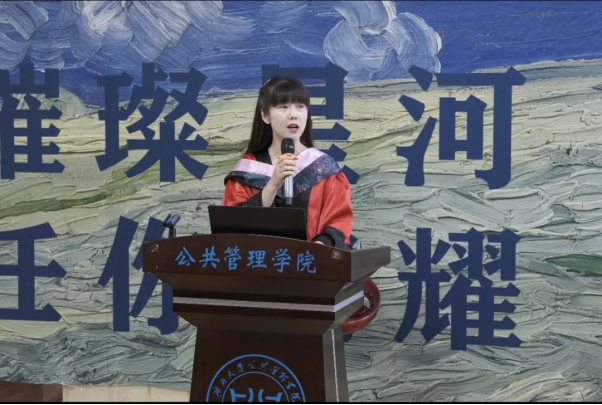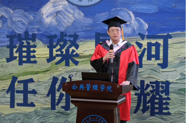 教师代表陈璟浩向即将毕业的公管学子做出希望:适应角色变化,拥抱变化。毕业是大学学习的终点,也是新生活、新征程的起点,即使生活和工作面临新的角色和挑战,也要勇于接受变化、善于适应变化、乐于拥抱变化,让人生在发展道路上精彩丰富;勇敢面对挑战,不惧困难。无论遇到什么困难,都勇敢面对,不断奋起,百折不挠地追逐人生理想,书写人生华章。