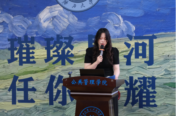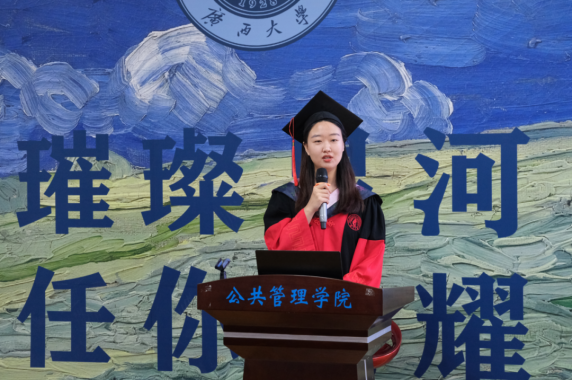 在校生代表王奕然衷心地对毕业生们顺利毕业表示诚挚的祝福。她深受优秀毕业生们的鼓舞,表示在今后的学业生涯发展中彰显作为、挺膺担当,展现西大公管人的独有风采。