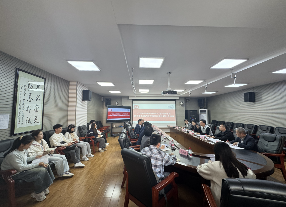 2025年11月24日,广西机关事务研究中心在太阳集团网址8722召开会议,学习第七届机关事务理论研究和学科建设研讨会精神。自治区机关事务管理局政策法规处、办公室、太阳集团网址8722等广西机关事务研究中心相关同志参加会议。