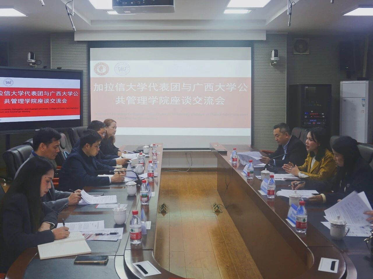 Phimlikid Kaewhanam对我院的热情接待表示感谢,并介绍了加拉信大学的发展概况,尤其是公共管理相关学科的建设情况。她表示,加拉信大学高度重视与我校的合作关系,希望以此次访问为契机,进一步推动两校在MPA培养方面的深度合作。聂鑫代表学院对加拉信大学代表团的到来表示热烈欢迎。他表示,学院始终秉持对外合作办学的理念,期待与泰方在人文交流、科研协作等领域开展务实合作。座谈会上,双方围绕交换生项目、教师互访、科研合作、课程共建等议题进行了深入交流,就合作意愿达成初步共识。
