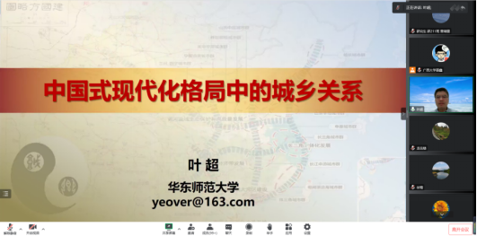 10月27日晚,华东师范大学叶超教授受邀来到公管名师大讲堂,以线上会议的方式为我院师生带来了中国式现代格局中的城乡关系的主题讲座,院党委书记聂鑫教授主持本次讲座,龙花楼教授、徐莺副教授等多位老师以及众多博士、硕士研究生参与此次讲座。