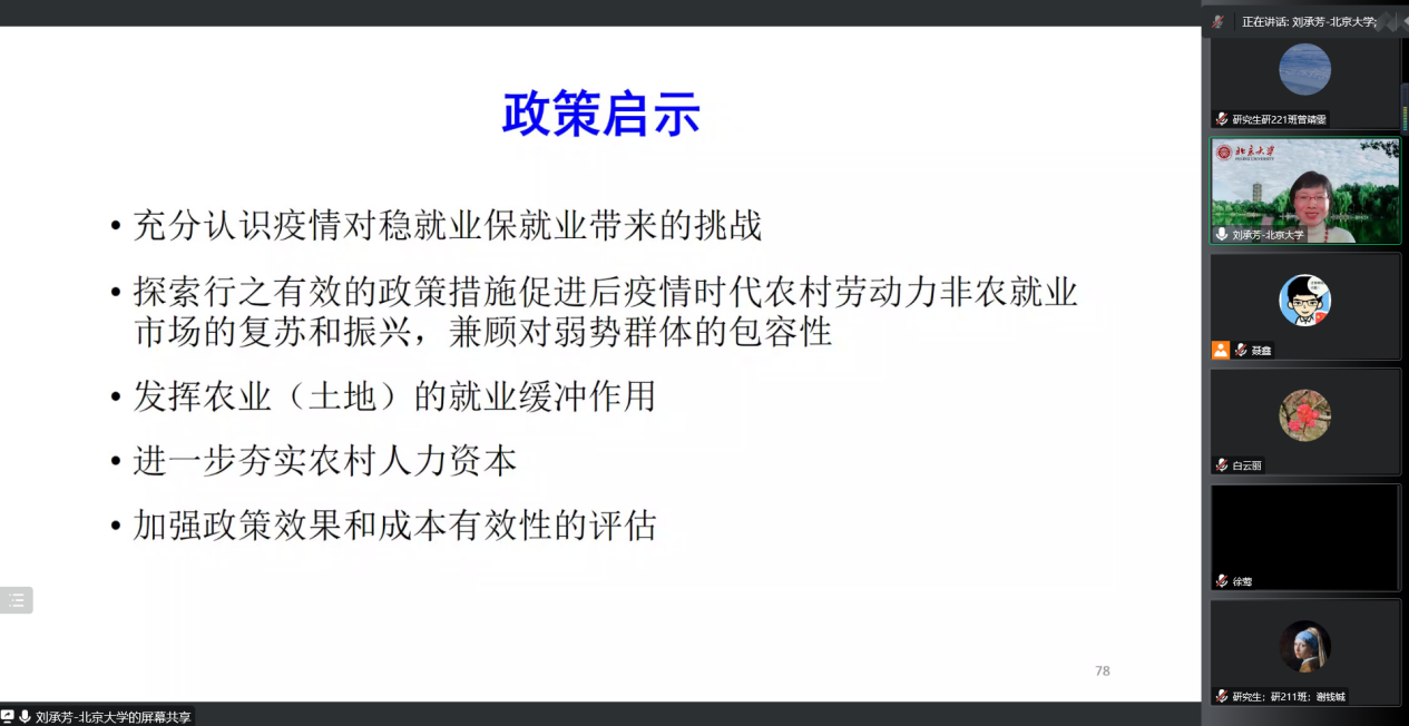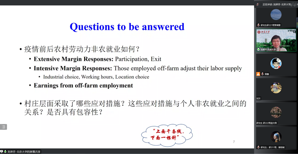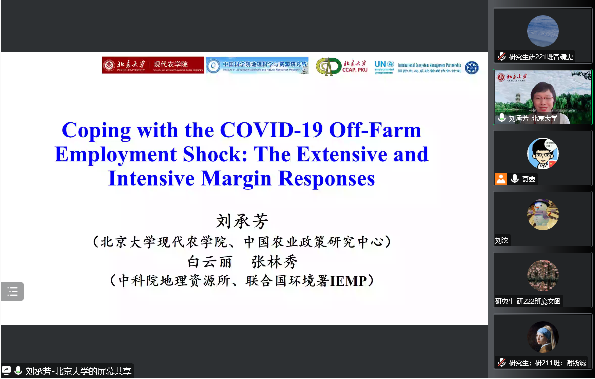 2022年12月1日下午,北京大学现代农学院副院长刘承芳教授受邀来到我院公管名师大讲堂,以线上会议的方式为我院师生带来了题为“Coping with the COVID-19 off-farm employment shock: The extensive and intensive margin responses”的主题讲座,我院党委书记聂鑫教授主持本次讲座,中科院地理资源所白云丽助理研究员、汪晗副教授、徐莺副教授、雷文艳老师等多名校内外教师及众多博士、硕士研究生参与此次讲座。