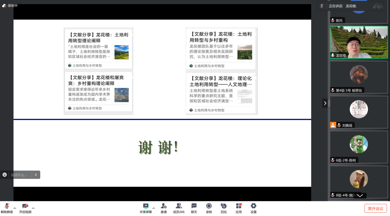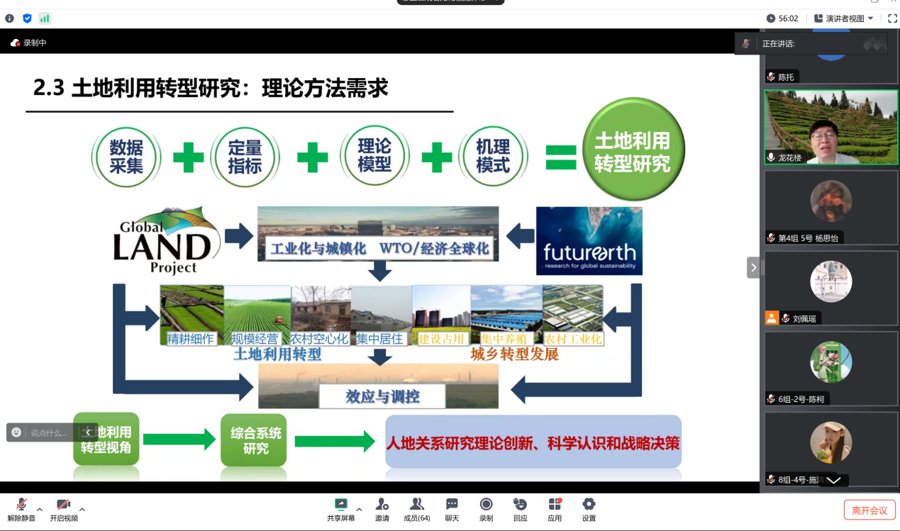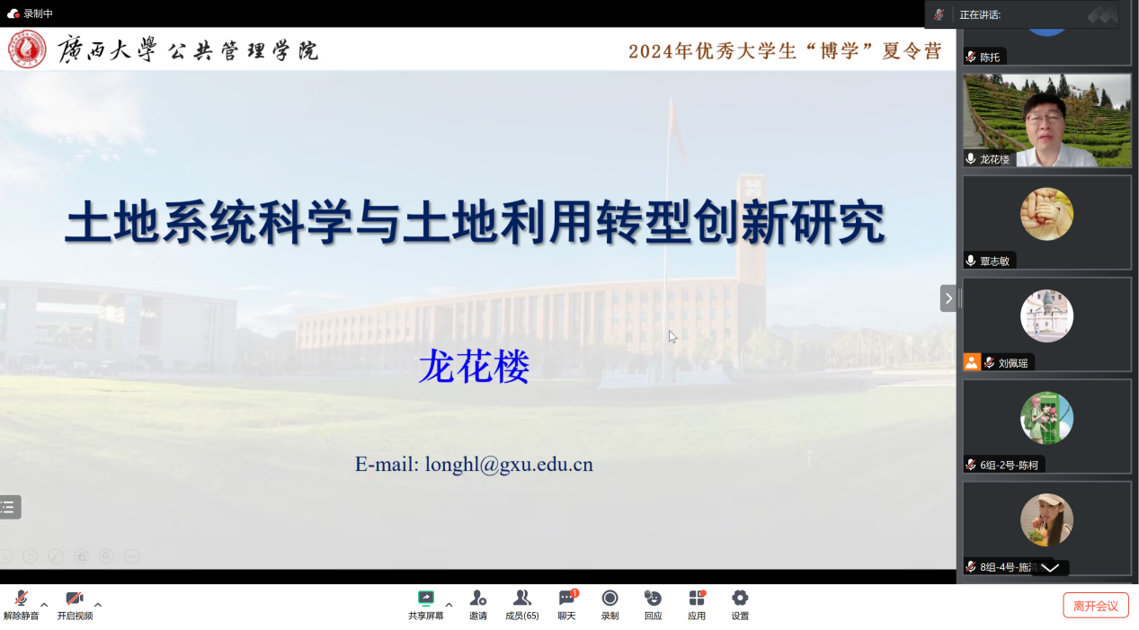 7月10日上午,我院教授龙花楼老师以线上形式作主题为“土地系统科学与土地利用转型创新研究”的学术讲座。本次讲座是我院2024年“博学”优秀大学生夏令营的环节之一,由我院副院长覃志敏主持,六十余名“博学”夏令营营员参与其中。