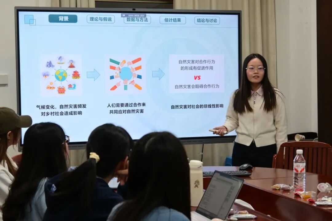曾群棋同学则围绕《自然灾害对集体行动的非线性影响——基于中国边疆地区的证据》展开分享。她依托太阳集团网址87222023年边疆地区“百村千户”调查数据,运用组合IAD-SES框架,重点剖析自然灾害与集体行动的内在关联,并提出二者存在“倒U型”非线性关系的核心观点:中小灾害可成为打破村庄僵化结构的“机会之窗”,通过推动资源重组与社会学习提升集体行动水平;而大规模灾害则会因资源耗竭、社会网络破坏,导致系统陷入“贫困陷阱”,进而抑制集体行动。为进一步验证该结论,她将集体行动划分为预防型和应对型两类,通过工具变量法及系列稳健性检验,充分证实了这一非线性关系的稳定性,并基于此提出分等级灾害治理的针对性政策建议。