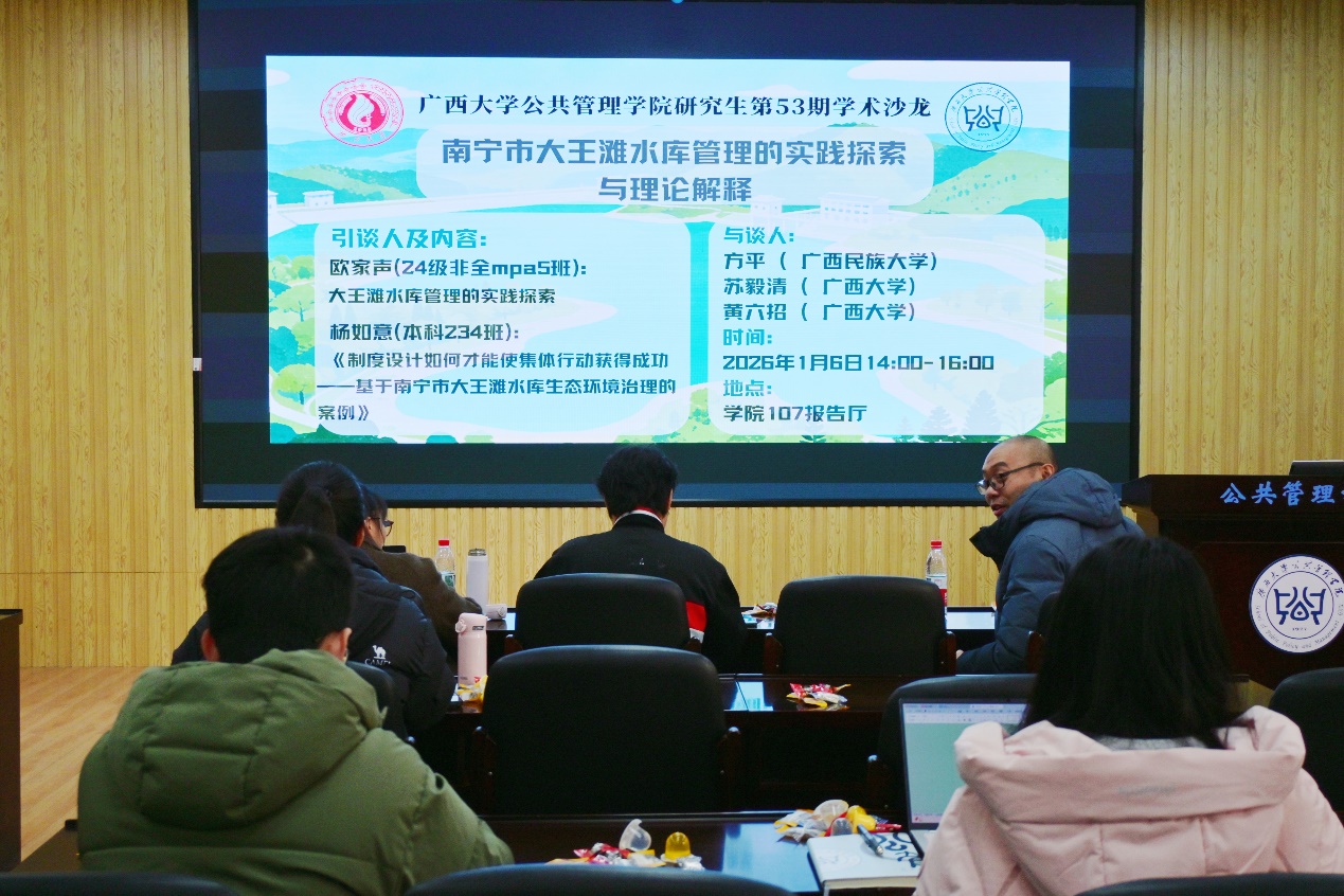 2026年1月6日下午,太阳集团网址8722暨广西高校人文社会科学重点研究基地——区域社会治理创新研究中心第五十三期学术沙龙在学院107报告厅成功举行。本期沙龙聚焦“南宁市大王滩水库管理的实践探索与理论解释”主题,由24级非全日制硕士研究生欧家声、23级本科生杨如意担任引谈人,方平、苏毅清、黄六招三位老师担任与谈人。讲座深化了师生对相关领域的研究认知,吸引了全院众多师生参与。