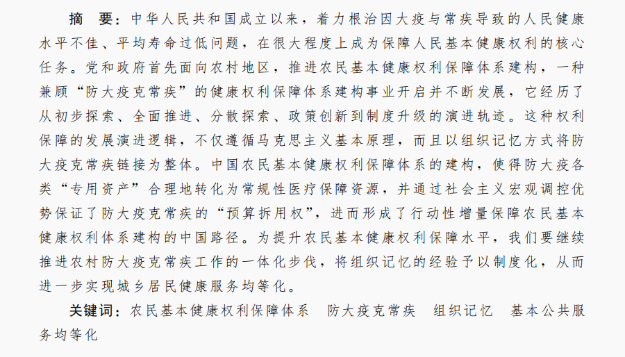 黄六招以合作作者在《中国社会科学》发文探讨农民基本健康权利保障体系建构与演进逻辑—— “防大疫克常疾”实践经验探索