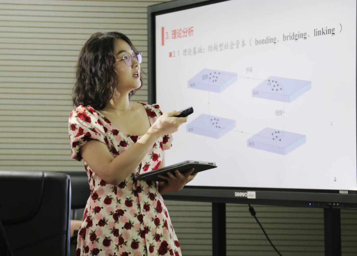 张诗斐同学分享的文章题目为《干部驻村何以促进乡村内生发展?——基于社会资本理论的个案探索》,该文章从研究背景与问题、文献综述、理论分析、案例选择与资料收集、案例分析、结论与讨论六个方面对乡村内生发展问题进行探究。该文章在既有研究的基础上,从结构型社会资本的视角出发,围绕以下问题进行了研究:为何有的村庄在驻村干部撤出后还能维持良好的自身发展?这些村庄的驻村干部究竟是通过何种途径使村庄获得了内生发展的能力?该文章选取广西D村驻村第一书记的工作经历作为案例研究对象,对D村发展困境、驻村干部重塑村庄社会资本的机制、村庄社会资本促进内生发展的机制进行了详细的分析。经研究发现,驻村干部通过自身的链接和桥梁社会资本,重塑了乡村的纽带、桥梁、链接三种社会资本,从而提高了村民的参与积极性,扩宽了村庄的资源获取渠道,形成了共同认同的发展目标,进而提升了乡村的内生发展能力。该文章围绕驻村干部、社会资本、内生发展、贫困治理四个方面进行了深入的探讨。