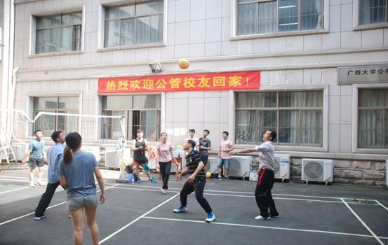 上午9时,校友们与在校师生之间在学院排球场展开了趣味横生的气排球热身赛。校友们虽离校已久,但在赛场却十分默契,经过激烈角逐,校友队在最后一局里抓住时机,反超了在校师生队,赢得胜利。