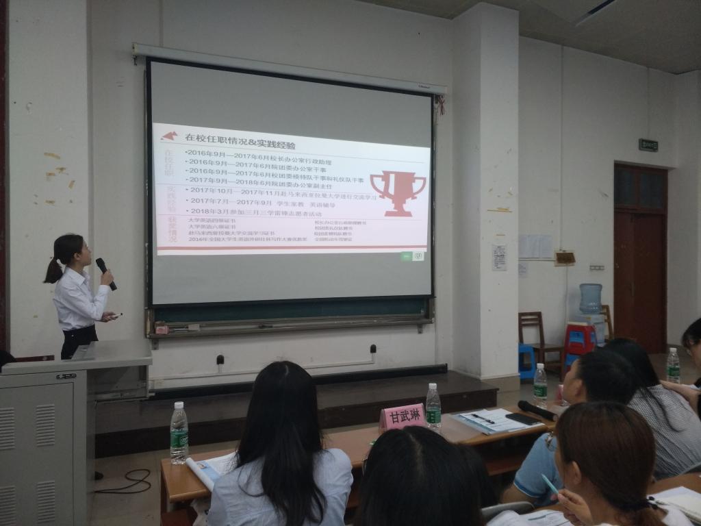 首先主持人开场,介绍了由院党委副书记甘武琳、刘佩瑶老师以及团委学生会的各位干部组成的第一评审团,随后13位竞选候选人(刘豪、李紫晴、吴恒玮、徐哲然、覃箫霖、梁潇、谭艳密、赵铭琦、邱逸琴、李陈瑶、梁恬恬、常欣斓、丘鹏霖)开始演讲。各竞选人从自我介绍、所获荣誉、职位认知、努力方向等方面来演讲,随后每人需要完成一道情景模拟题以考验解决问题的能力,而后由第一评审团对每个人提出不同问题,竞选人现场作答。