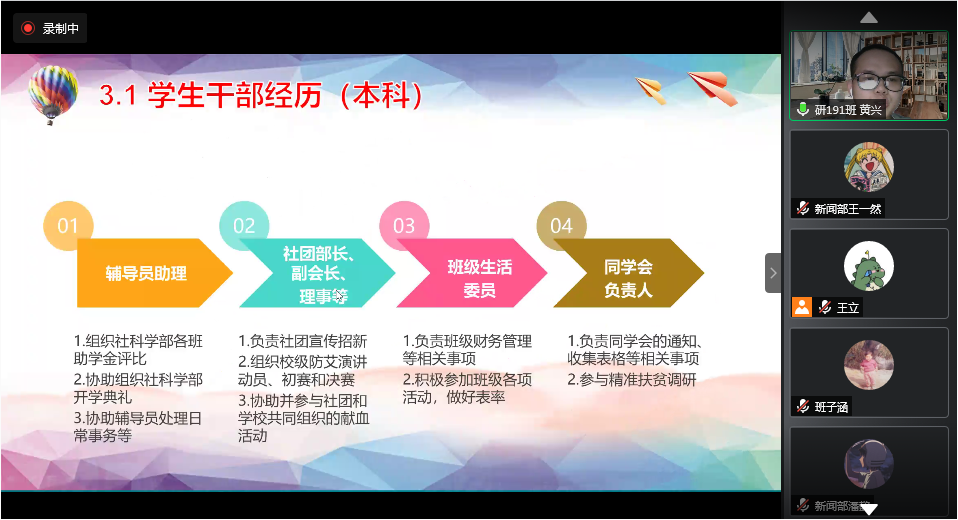 接着是会议的主要议程——竞选演讲,演讲通过竞选人抽签后进行线上展示的方式进行,每人有3-5分钟的展示时间。一共有16位同学参与竞选,他们分别是黄兴、王梦楠、陈娅、蒋文倩、潘懿、杜亚楠、陈美合、郭凯、吴天赐、班子涵、刘含笑、祁拯、蒋春艳、杨媛媛、王梅和陈旭(按发言先后顺序)。这16位同学竞选的职位包括主席、副主席、学生会助理团以及各部门部长等。参与竞选的同学表达了对研会的热爱与工作热忱,介绍了自己丰富的工作经历并指出了自己的竞争优势,还畅谈了对于未来研会工作流程优化和工作质量整体提升的期待,并对现任主席、部长等研会核心成员对自己的无私帮助和精神鼓励表达了感谢。
