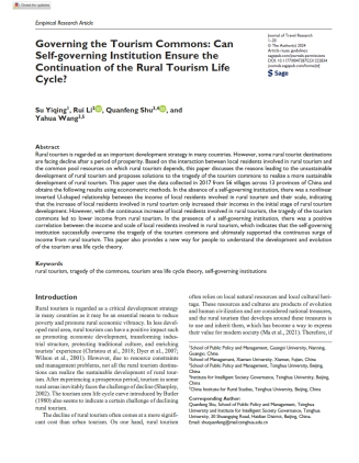 Yiqing, S., Li, R., Shu, Q., & Wang, Y. (2024). Governing the Tourism Commons: Can Self-governing Institutions Ensure the Continuation of the Rural Tourism Life Cycle? Journal of Travel Research, 0(0). https://doi.org/10.1177/00472875231222834