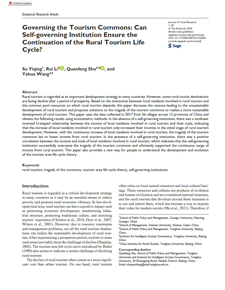 Recently, a study by Su Yiqing, Associate Professor at Guangxi University School of Public Policy and Management; Li Rui, a Ph.D. candidate at Xiamen University School of Management; Shu Quanpeng, Assistant Research Fellow at Tsinghua University's Institute for Smart Social Governance; and Wang Yahua, Professor at Tsinghua University's School of Public Policy and Management and Executive Director of the China Rural Research Institute, has been published in the internationally renowned journal Journal of Travel Research (SSCI-indexed, 2023 IF = 8.9). The paper, titled 、Governing the Tourism Commons: Can Self-governing Institutions Ensure the Continuation of the Rural Tourism Life Cycle? employs a Social-Ecological System (SES) framework and uses survey data from 56 rural tourism villages across 13 provinces in China to empirically examine the impact and mechanisms of self-governing institutions on mitigating the tragedy of the commons and extending the life cycle of tourism destinations.