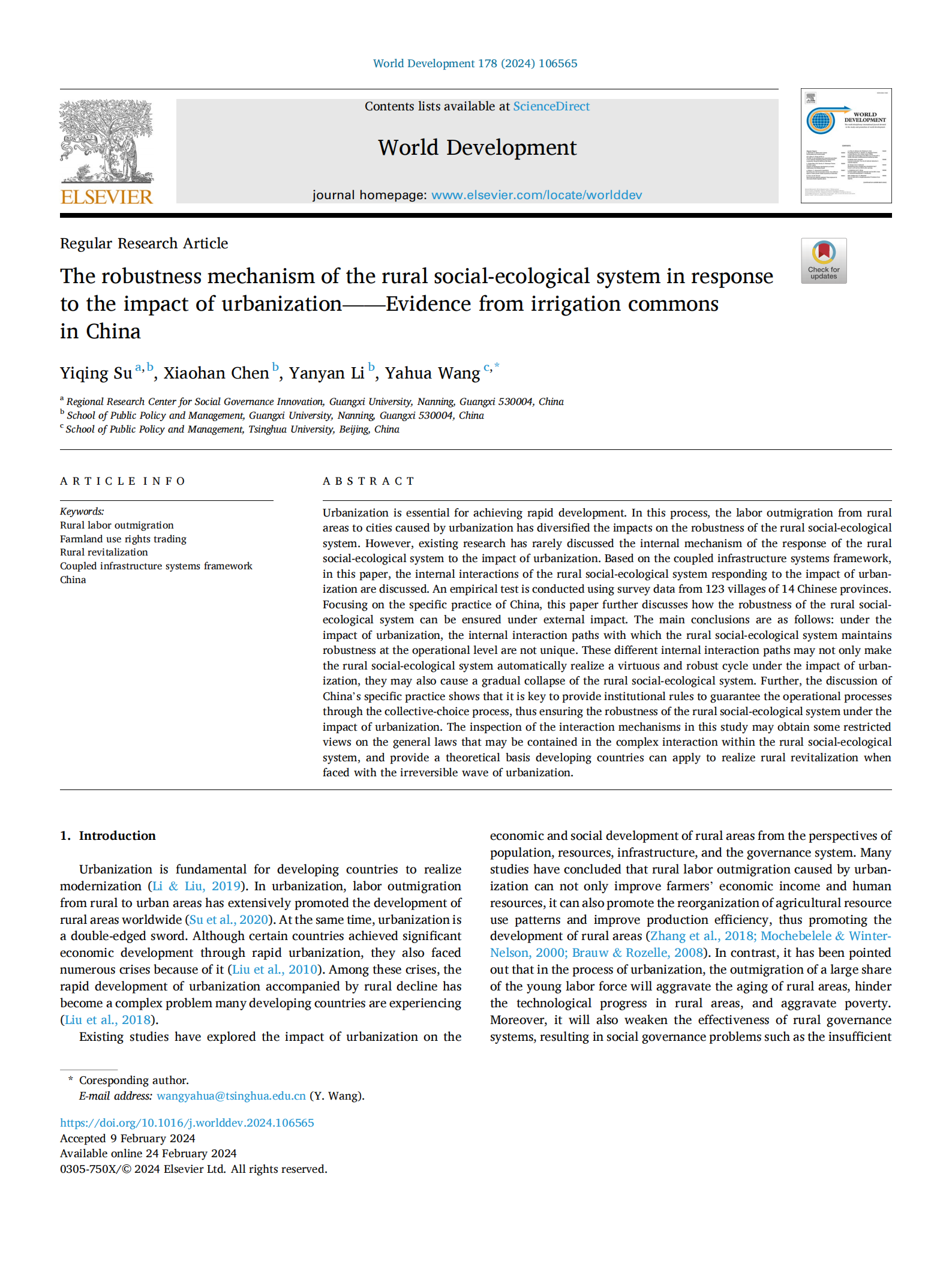 Yiqing, S., Chen, X., Li, Y., & Wang, Y.* (2024). The robustness mechanism of the rural social-ecological system in response to the impact of urbanization——Evidence from irrigation commons in China. World Development , 178: 106565. https://doi.org/10.1016/j.worlddev.2024.106565